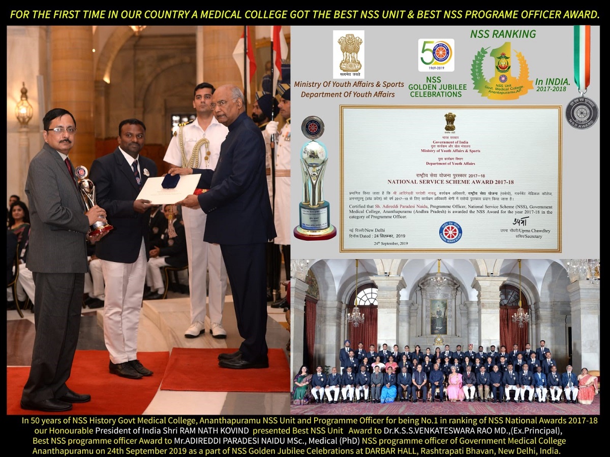 Previous principal Dr.KSS. Venkateswra Rao and programme officer A. Paradesi Naidu Received best NSS unit Ranking -1 and Programme officer ranking -1 in entire India frist time in the history of Medical Colleges on 24th Sep